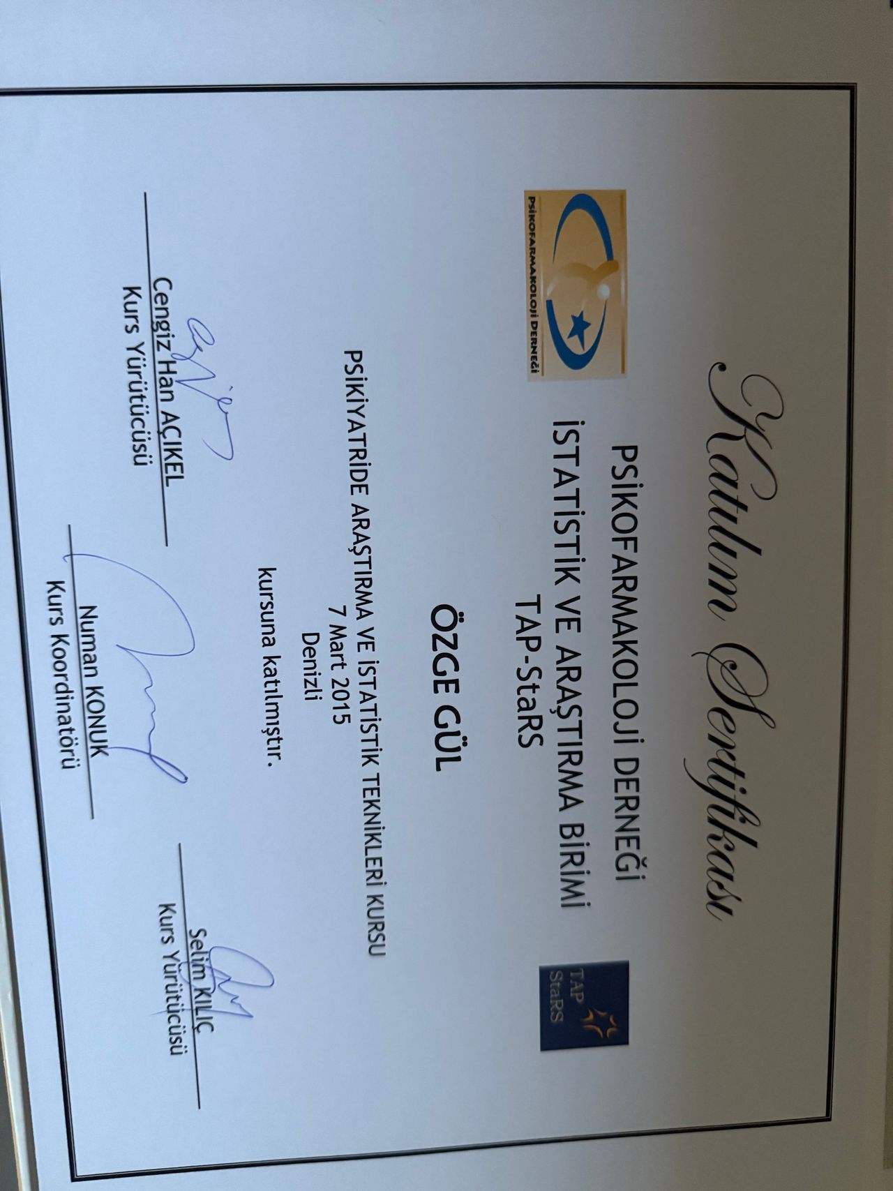 2015 yılında Psikofarmakoloji Derneği İstatistik ve Araştırma Birimi Tap-StaRS kursu katılım sertifikası