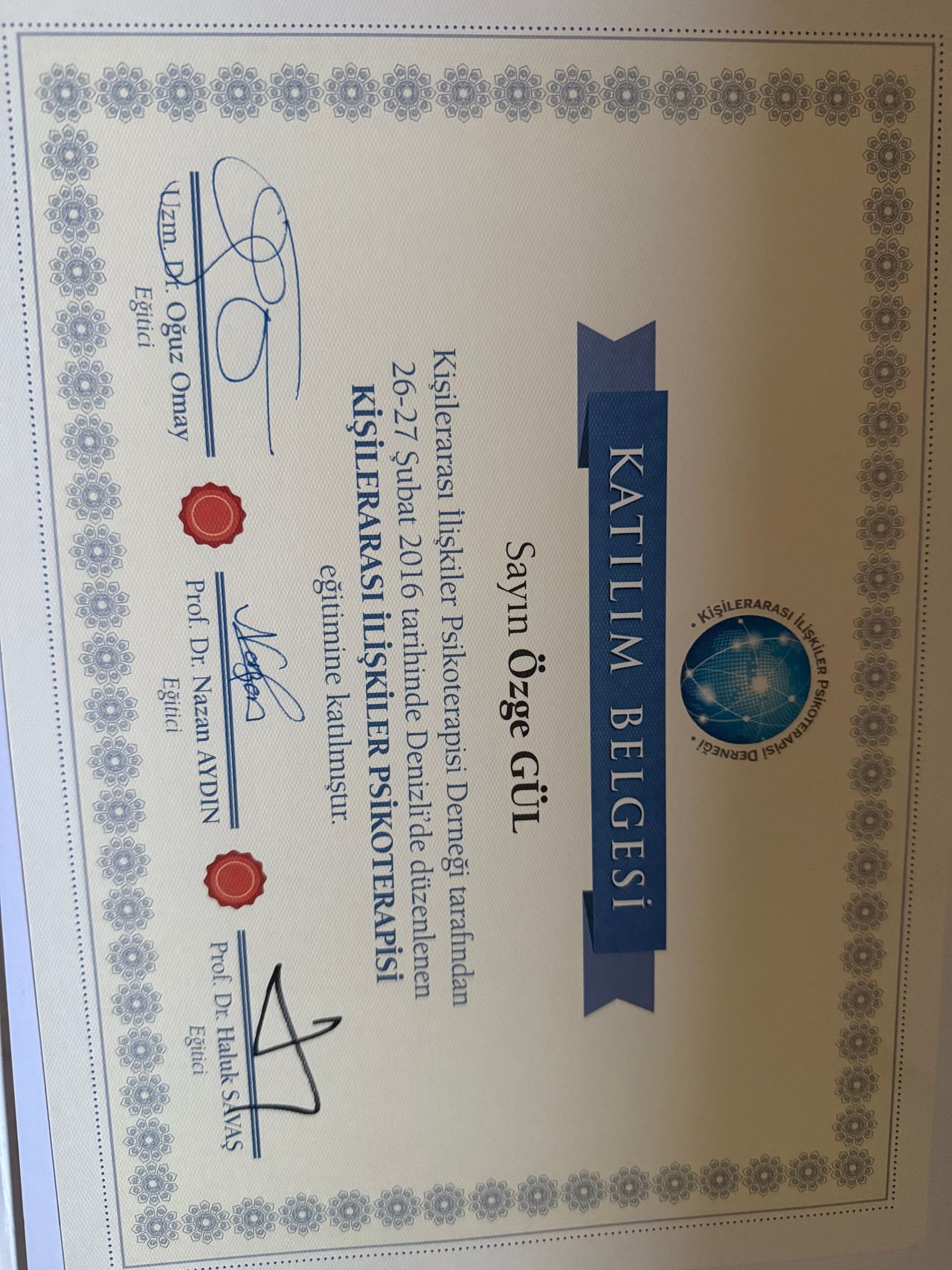 2016 yılında kişilerarası ilişkiler psikoterapisi eğitimine katılım sertifikası