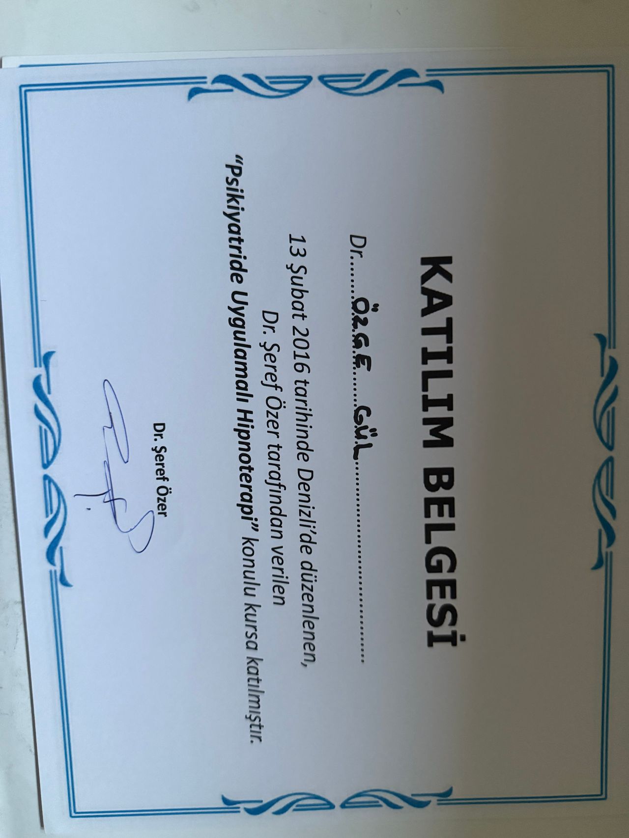 2016 yılında uygulamalı Hipnoterapi kursu sertifikası